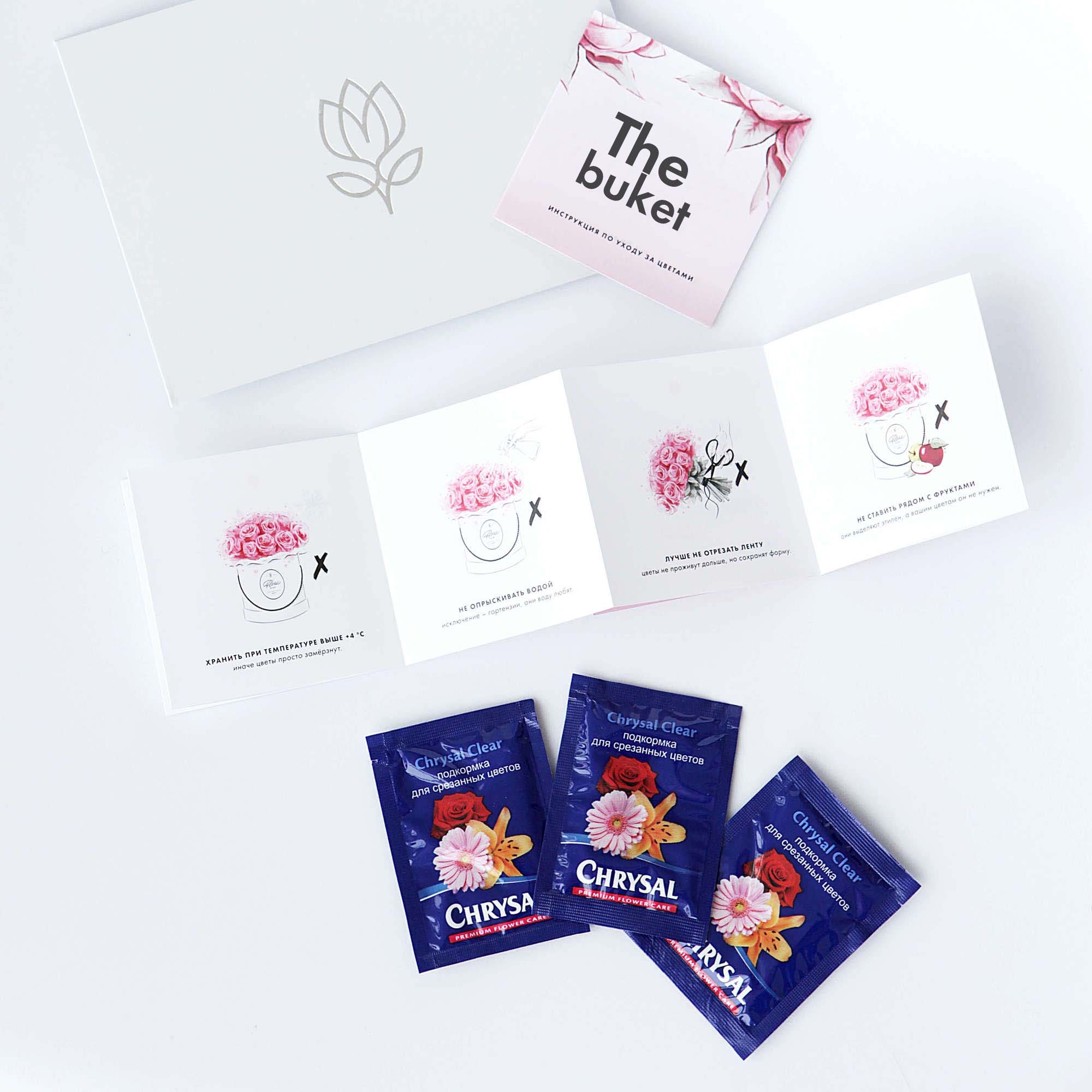 К букету прилагаются инструкция по уходу и средство, продлевающее жизнь цветов.